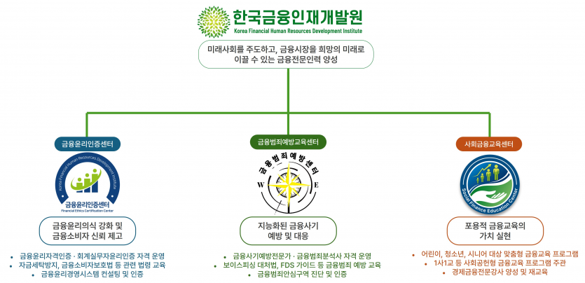 먼저, 금융윤리인증센터(https://k-fec.kr)는 금융인의 윤리 의식 강화와 금융소비자 신뢰 제고를 목표로 설치되었다. 주요 사업으로는 ▲금융윤리자격인증 및 회계실무자윤리인증 자격 운영 ▲자금세탁방지(AML), 금융소비자보호법 등 금융 법령 교육 운영 ▲금융윤리경영시스템 컨설팅 및 인증 등이 있다.